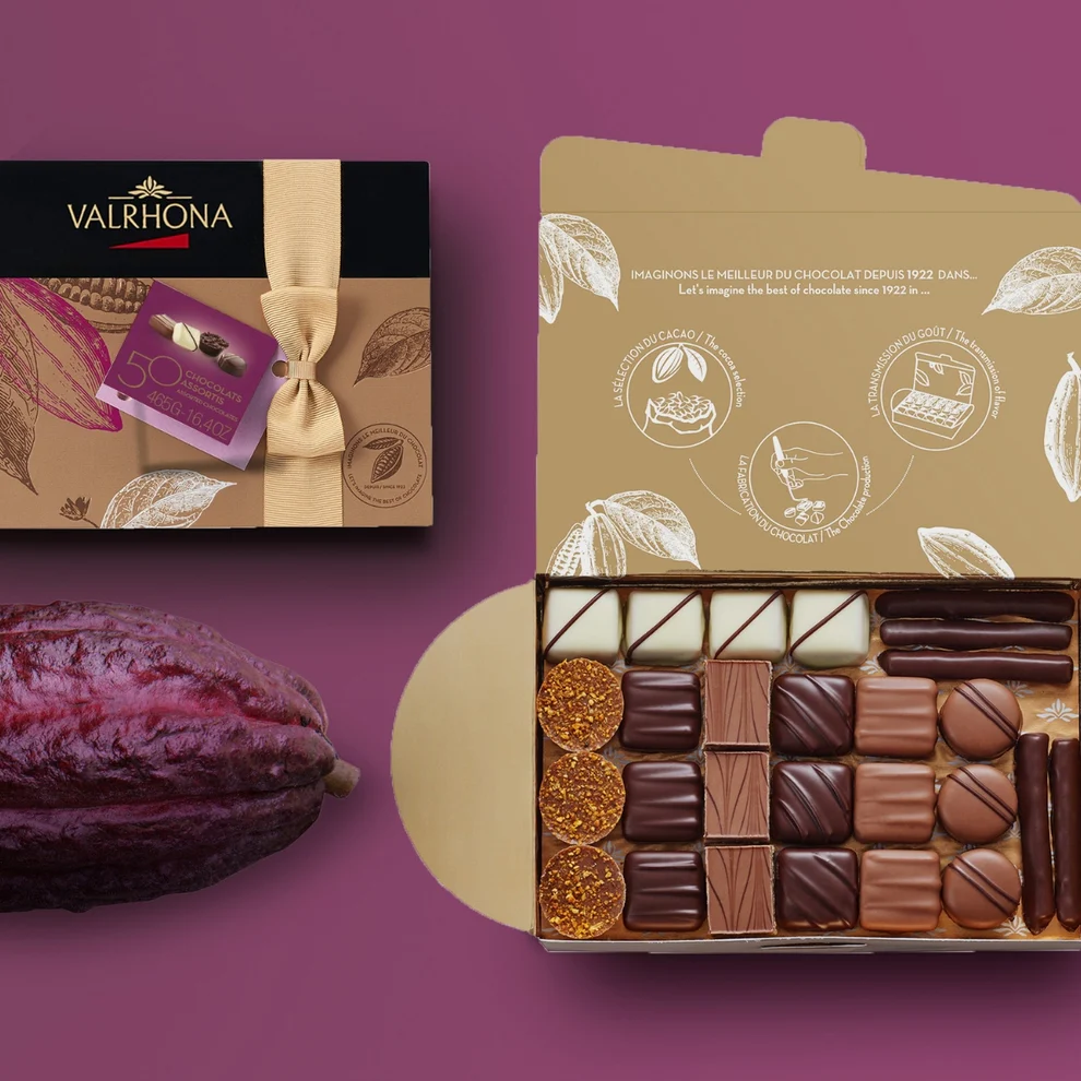 Une sélection gourmande de 50 chocolats fins de 15 variétés pour toutes les occasions de dégustation et toutes les envies. Valrhona dispose d’une large sélection de bonbons de chocolat qui permettent de découvrir différents Grands Crus et des recettes originales. Vous trouverez dans ce ballotin éco-conçu et entièrement recyclable un assortiment de 50 chocolats, symbole du savoir-faire Valrhona.