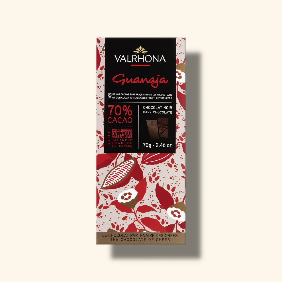 Dénomination légale : Chocolat noir (70% de cacao minimum, pur beurre de cacao). Ingrédients : fèves de cacao, sucre, beurre de cacao, émulsifiant: lécithine de tournesol, extrait naturel de vanille. Lait (Fabriqué dans un atelier qui utilise du lait). Présence possible de : gluten, fruits à coque, soja.